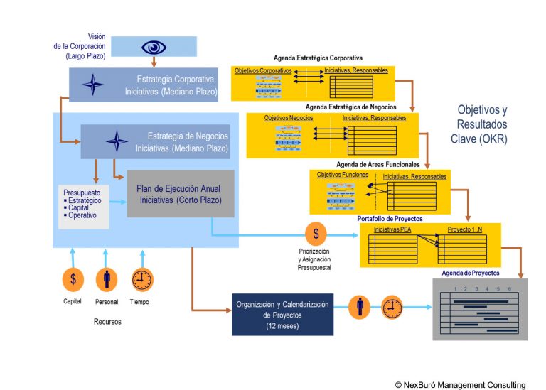 Para hacer realidad su estrategia usted necesitará tener en cuenta los elementos críticos que le permitan ejecutarla con éxito: información compartida, reglas de decisión, coordinación entre unidades de negocio y funcionales, proyectos a implementar, estructura de organización y procesos de negocio. En este contexto Nexburó lo ayuda a integrar estos aspectos y lo acompaña en el seguimiento de su implantación.